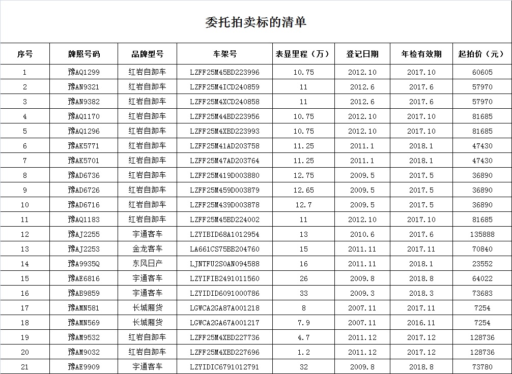 受委托,我行定于2018年2月(yuè)(yuè)2日星期五上(shàng)午10時(shí)30分(fēn),在鄭州拍賣總行拍賣廳(桐柏路(lù)與隴海路(lù)交叉口東南(nán)角金(jīn)中環B座32層)舉行拍賣活動 ,公開拍賣:整體(tǐ)拍賣機動車21輛(紅(hóng)岩重型自卸貨車13輛、宇通大型客車4輛、金(jīn)龍大型客車1輛、長城輕型箱式貨車2輛、東風(fēng)輕型貨車1輛)