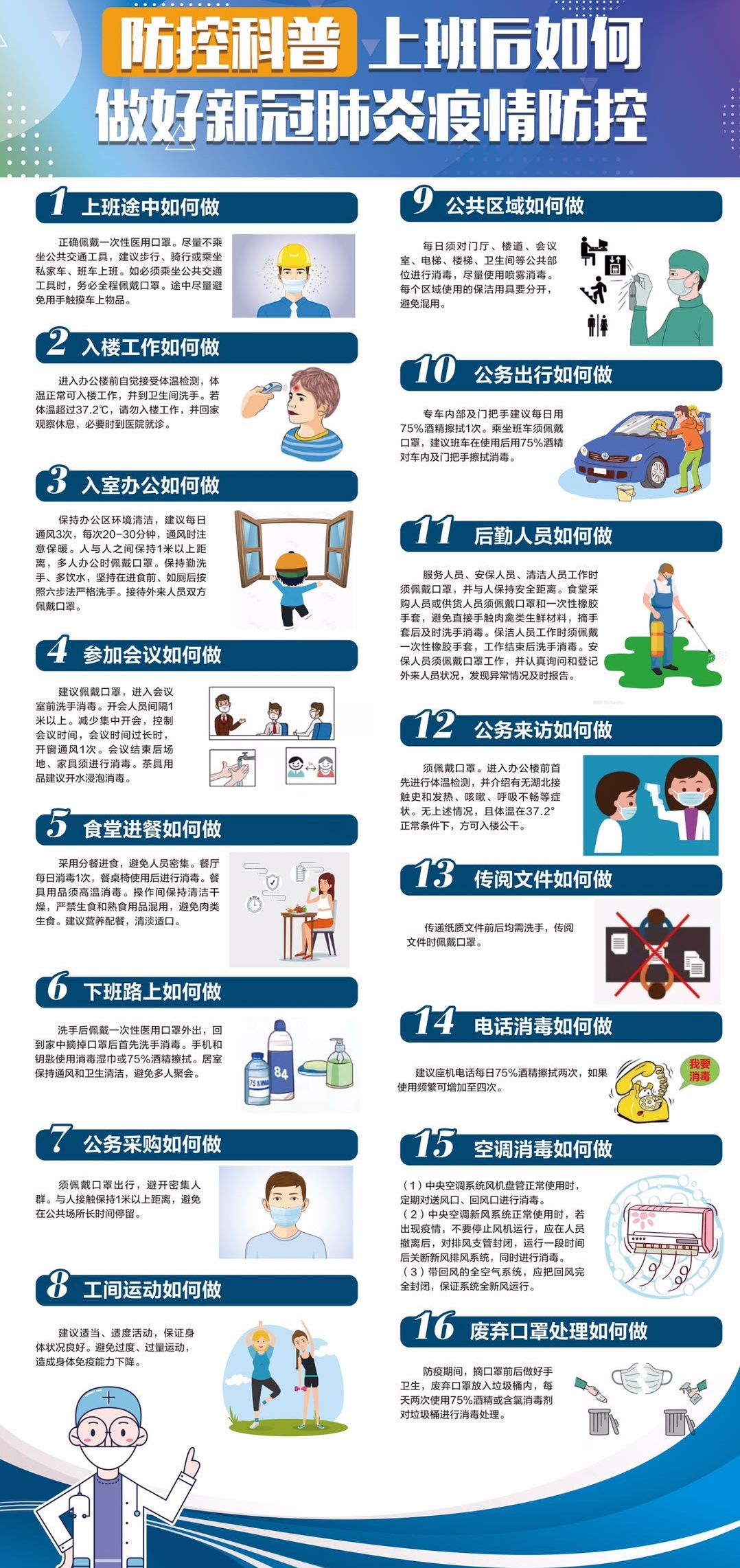 企業宣傳人(rén)員(yuán)每天實時(shí)發布疫情相關(guān)宣傳文字,企業要求每位員(yuán)工每天在微信群及時(shí)轉載企業公衆号實時(shí)發布的信息及宣傳海報(bào),同時(shí)引導職工盡量不外出、不聚餐,不到人(rén)多擁擠和空間(jiān)密閉的公共場(chǎng)所,如(rú)必須外出,務(wù)必佩戴口罩,回家後用酒精消毒等衛生(shēng)常識,切實做好(hǎo)(hǎo)個(gè)人(rén)衛生(shēng)防護,增強體(tǐ)質和免疫力。